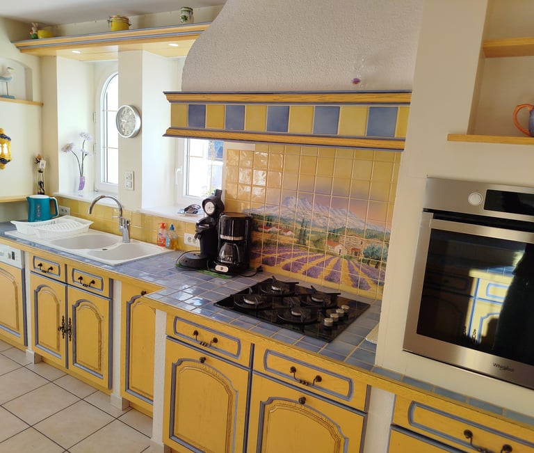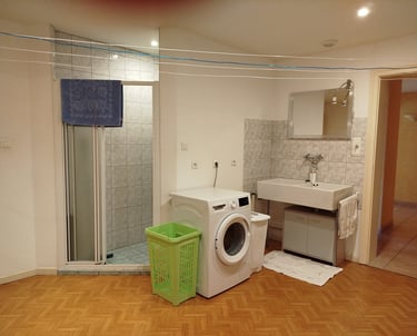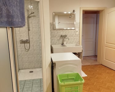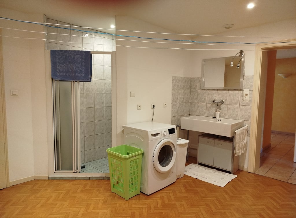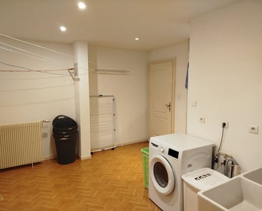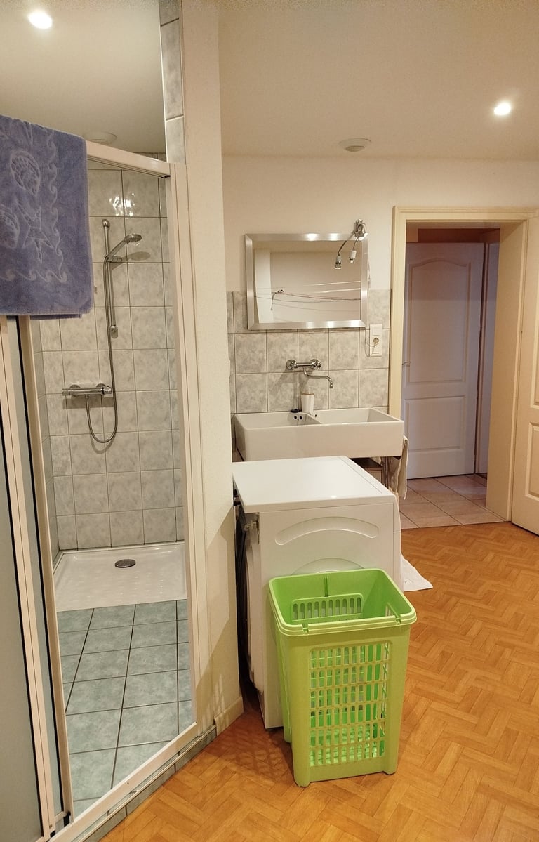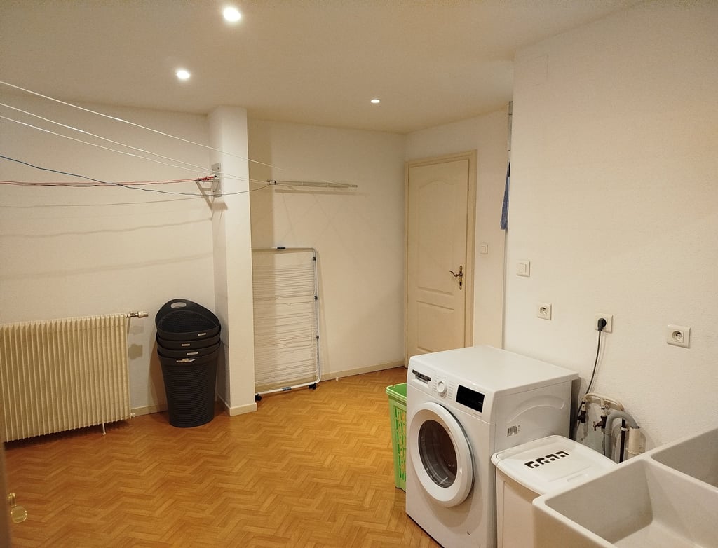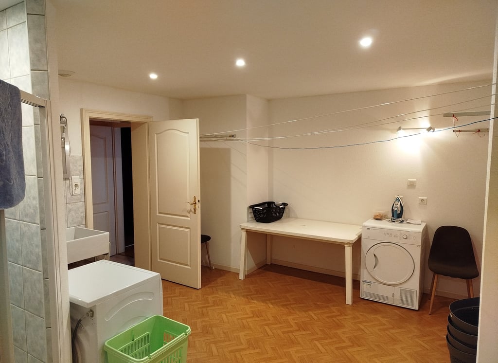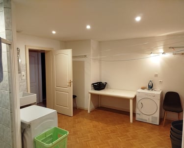 Avec machine à laver, sèche linge, lavabo double, une douche, planche à repasser avec fer à repasser, fils à linge